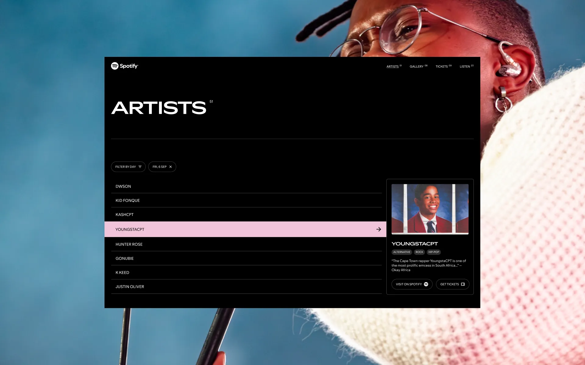 The custom UI moments are where the site does its best work. Patterns that would normally default to global Spotify components were rebuilt where it mattered, with motion design tuned to the energy of the event rather than the polish of a product page. The result reads as a campaign site that knows exactly which audience it is for, sitting comfortably inside the parent brand without disappearing into it.
